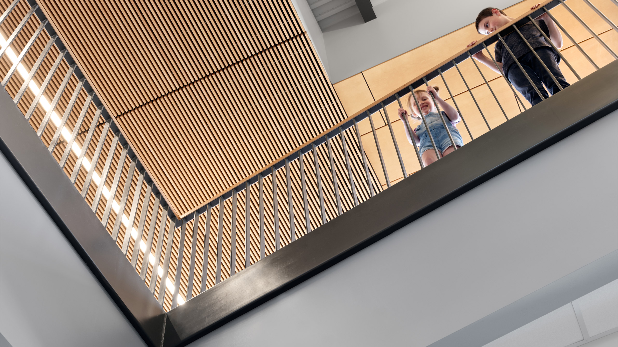 The landscape expresses an implied connection between the entry courtyard and playgrounds, which enliven the public zone. View corridors are created at the classroom wings where small group instruction takes place, allowing daylight to flow into the corridors.