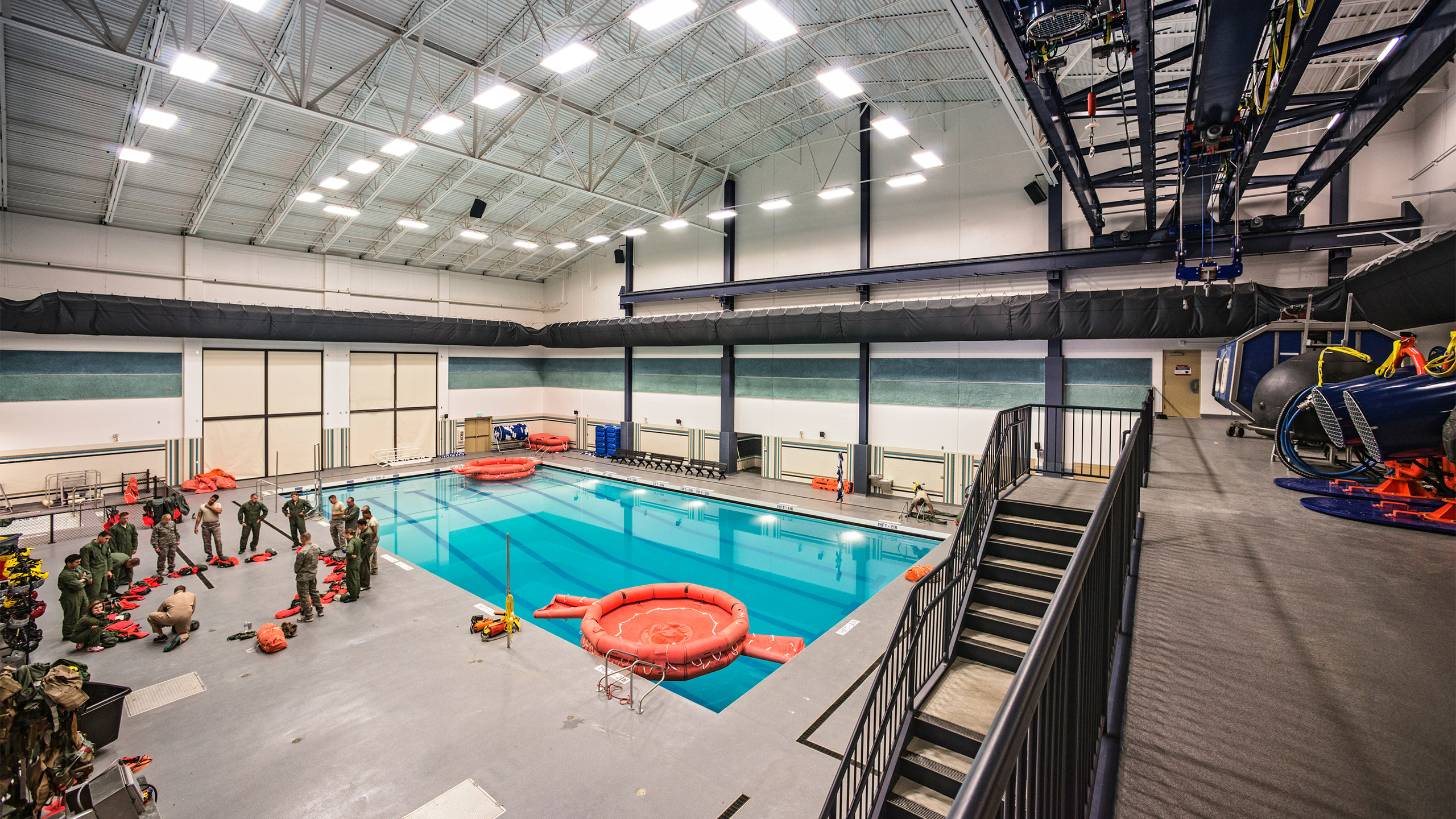 This 80,000 sf fitness center was completed via a competitive design-build process. The facility includes a gymnasium, indoor pool, locker rooms, fitness equipment spaces, racquetball courts, elevated running track and associated support spaces. It also includes a health and wellness center and support facilities for the Water Survival Training Center.