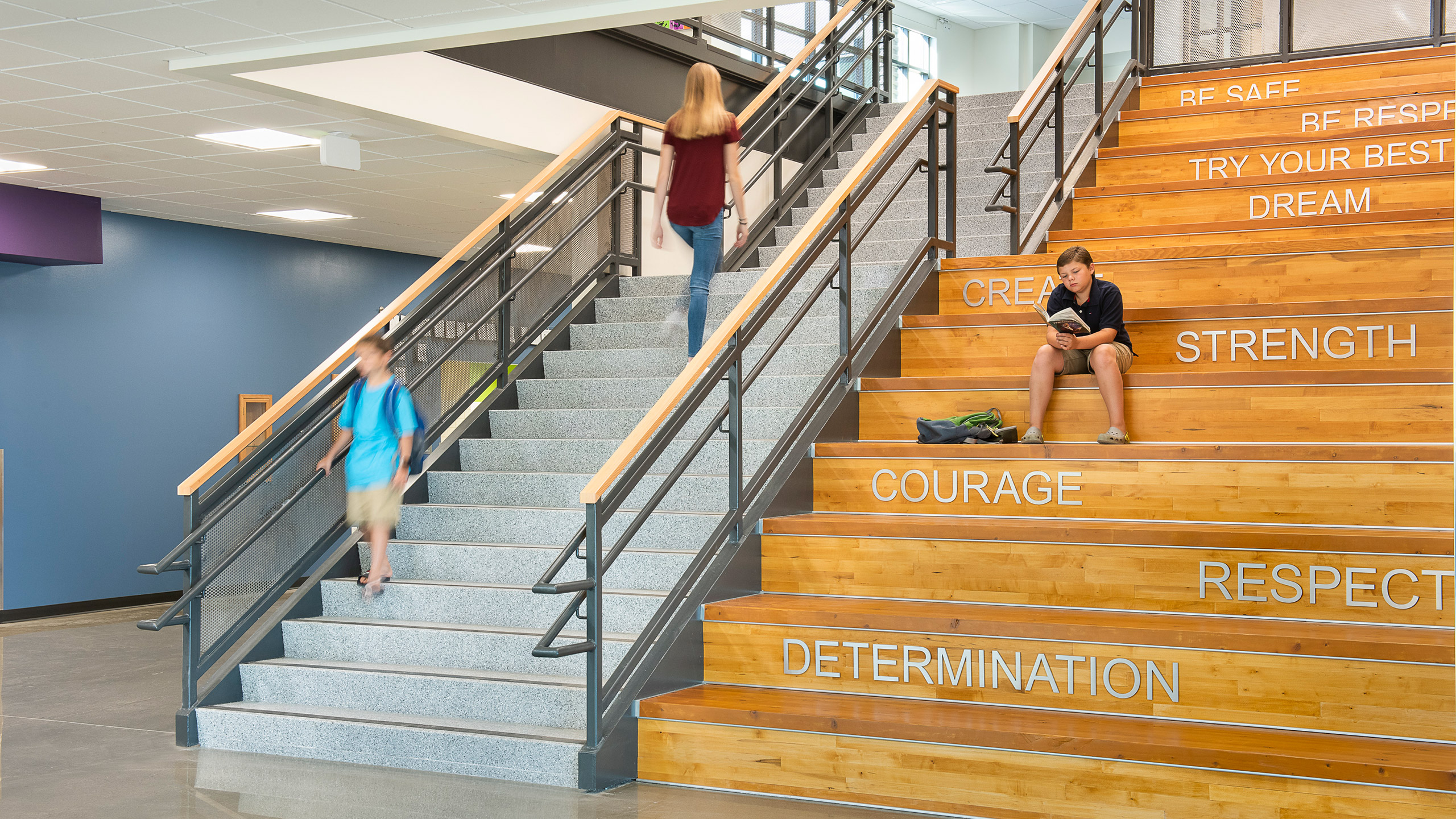 The use of masonry, metal and glass provide a timeless character and emphasize its importance as a civic and public building for the community. The site is organized to focus on student safety by providing separation between bus and parent drop-off areas.